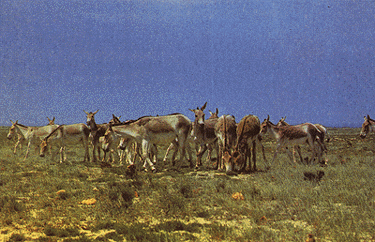 A herd of kulans or Asiatic wild asses (Equus hemionus) on the Kirghiz Steppe.