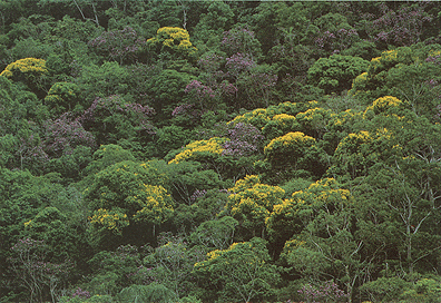 Seasonal rainforest in bloom. In eastern Brazil, the precipitation is unevenly distributed throughout a year causing synchronous flowering in many tree species..
