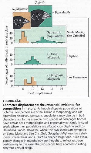Character displacement among different species of finches in the Galapagos. Due to local competition, certain characters, in this case bill depth, changed in a way that allow these two species to coexist.
