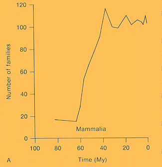 The rate of speciation and extinction are strongly related to the level and degree of environmental changes. Terrestrial habitats are less predictable and are more prone to greater and more abrupt changes then aquatic habitats, and thus extinctions occur at a higher rate. It is not clear, however, why the number of mammalian families remains relatively constant after an initial steep increase.