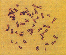 | The structure and the actual picture of a chromosome. | Human chromosome set from a skin cell. |